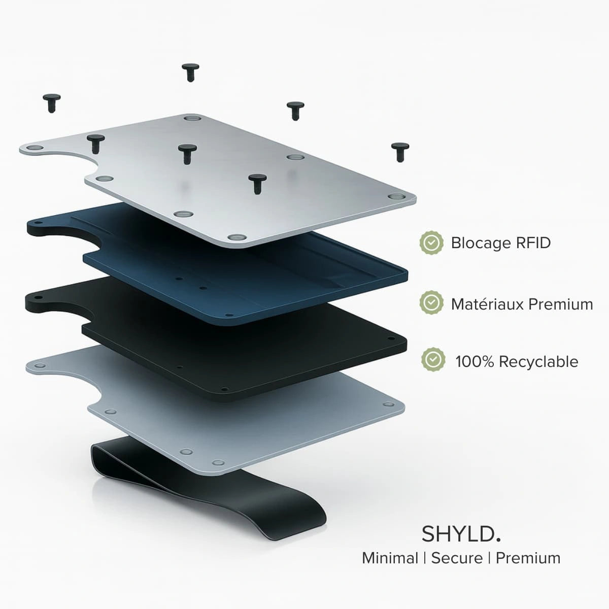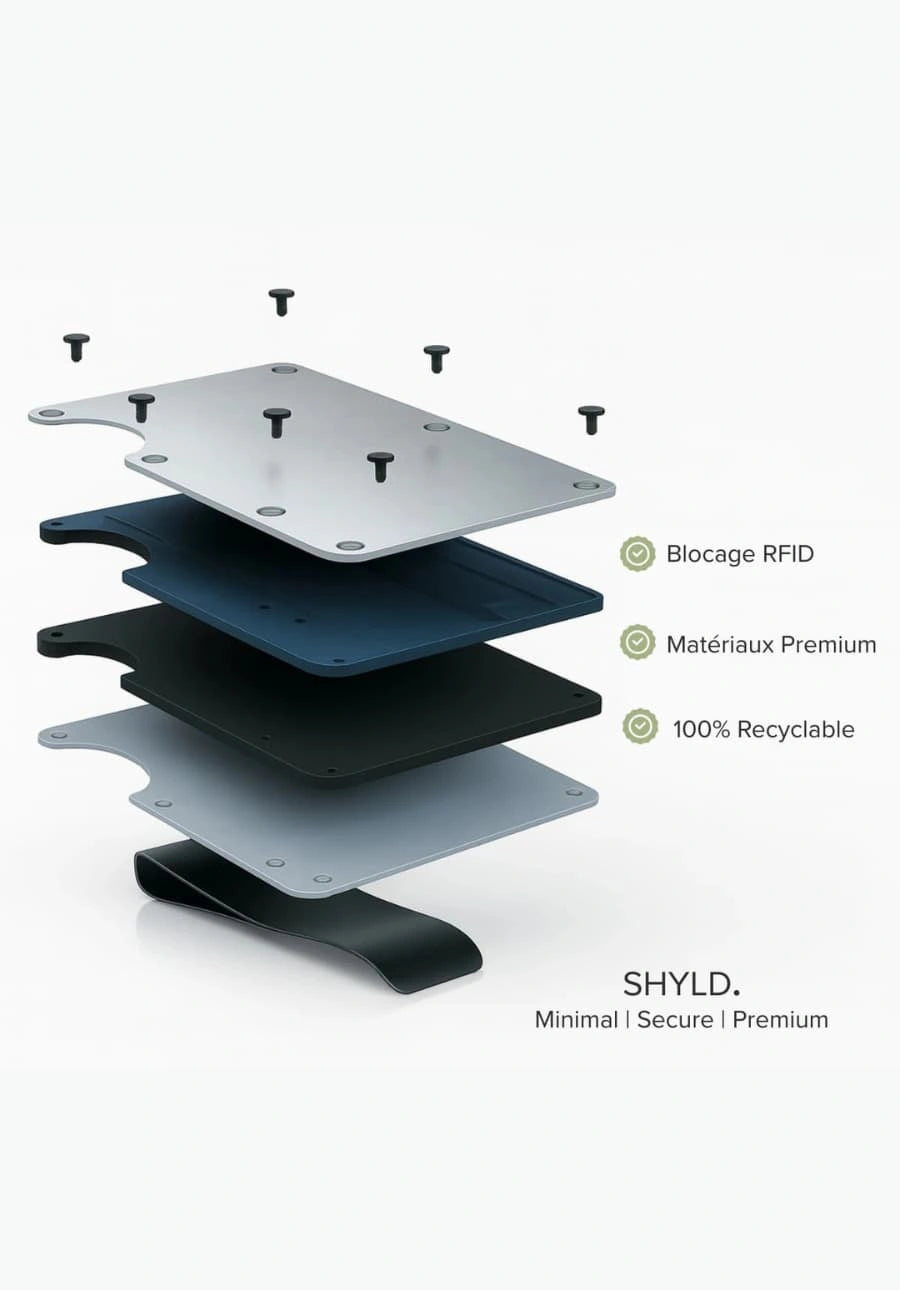 Les porte-cartes SHYLD. intègrent un blindage en aluminium anodisé de haute qualité qui bloque les signaux RFID non autorisés. (Skimming)